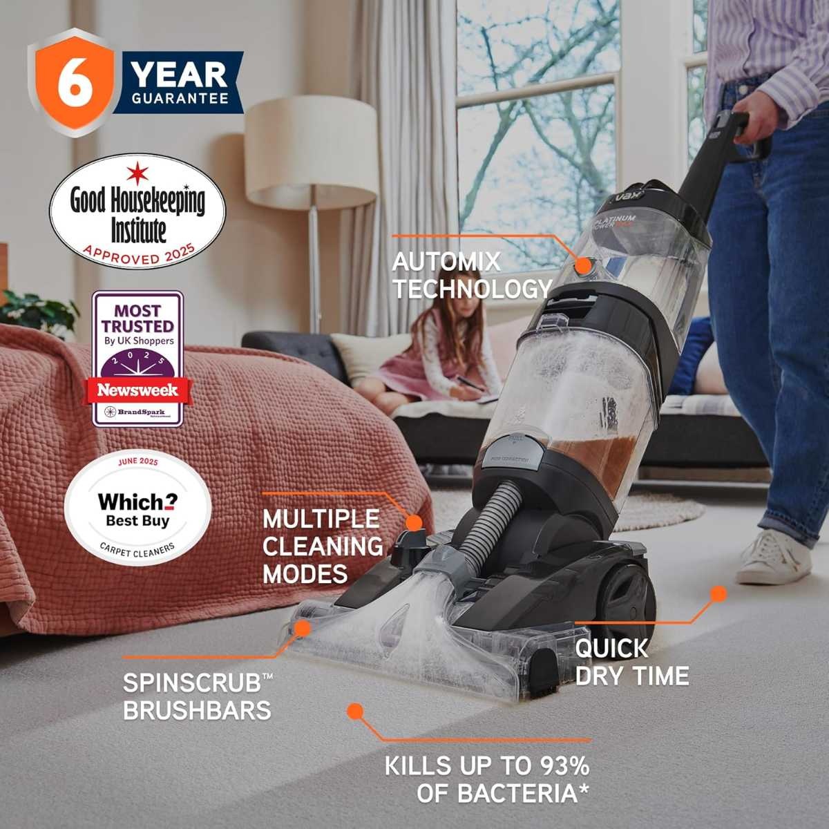 - POWERFUL DEEP CLEANING :- Cleaning carpets 5x better than a high-performance vacuum cleaner with 3.5L clean and 2.9L dirty water tanks whilst removing up to 93 percent of bacteria with the VAX Platinum Professional Solution, leaving carpets smelling and looking clean